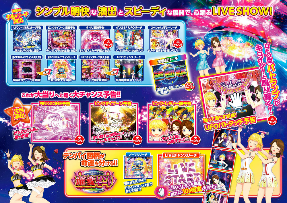 Kokuhen LIVE Mode: Immerse yourself in the prolonged excitement with the "Kokuhen LIVE Mode", where the electric support continues until the next jackpot hits, entering after the SUPER PINKLADY BONUS and the PinkLady Chance BONUS.